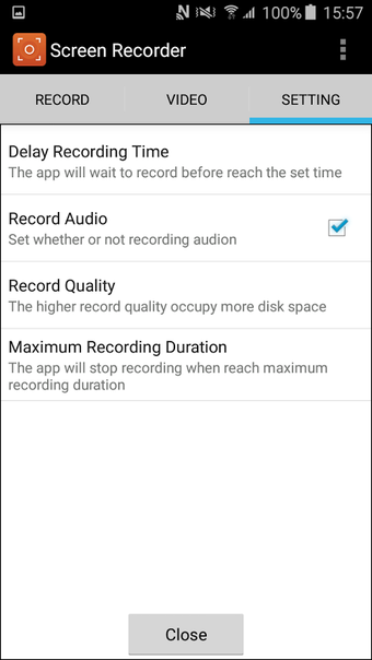 يوفر التطبيق عدة خيارات لجودة التسجيل ويسمح للمستخدمين بالتقاط الصوت من الميكروفون، ودمجه تلقائيًا في الفيديو. يمكن للمستخدمين إيقاف التسجيل عن طريق هز الجهاز، أو إيقاف تشغيل الشاشة، أو النقر على أيقونة إشعار التطبيق. تشمل الميزات الملحوظة غياب العلامات المائية، تسجيل بدقة الشاشة الكاملة، وأدوات لتقليم، وعرض، وحذف، ومشاركة مقاطع الفيديو على منصات مثل يوتيوب، وDrive، وDropbox، وفيسبوك. بالإضافة إلى ذلك، يتضمن مؤقت عد تنازلي لمساعدة المستخدمين على الاستعداد قبل التسجيل.